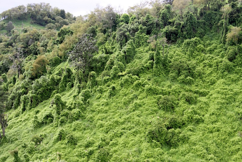 Smothers and kills all plants to the highest canopy, and prevents the establishment of native plant seedlings. Moves readily into established forest over canopy and by layering.