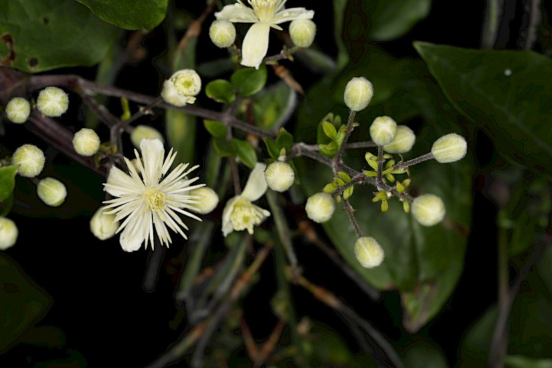 Deciduous, climbing, layering vine (<20 m tall) with very long, woody stems with six prominent ribs (appear as furrows in older vines) and pale, easily rubbed-off bark. Leaves are arranged in opposite pairs on the stems, and are made up of five (rarely three) widely spaced leaflets that fall in autumn. Thin, papery leaftlets are sparsely hairy and have bluntly toothed or smooth edges. Creamy white, fragrant flowers (2-3 cm diameter, Dec-May) are followed by grey, hairy seeds (2-3 mm long) with distinctive white plumes (3-4 cm long) in dense, fluffy clusters persisting over winter (hence the ‘old man’s beard’). N