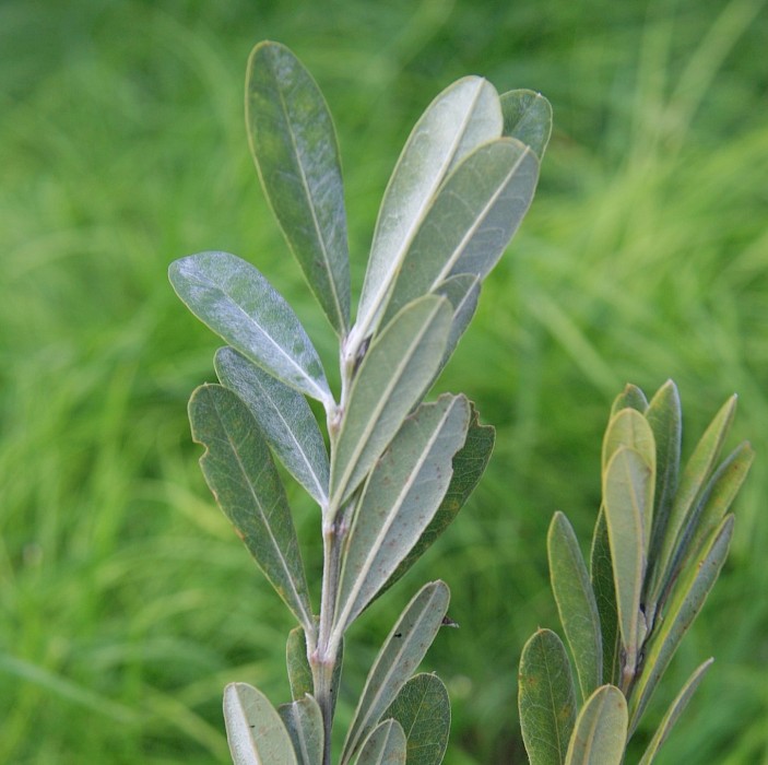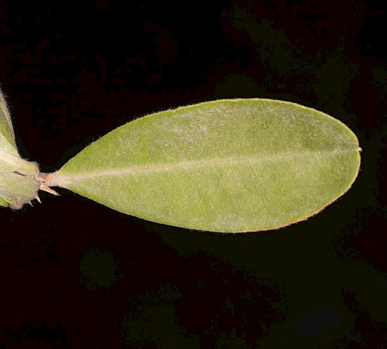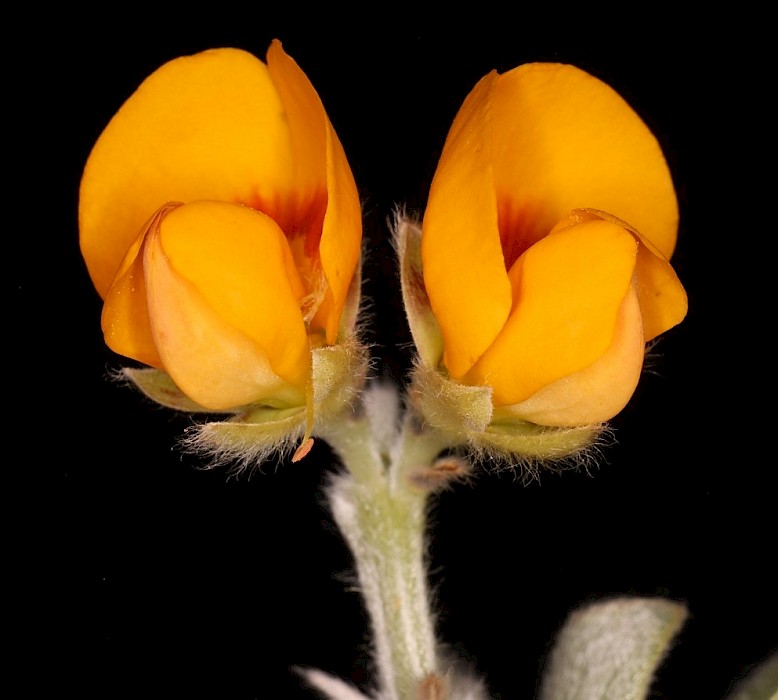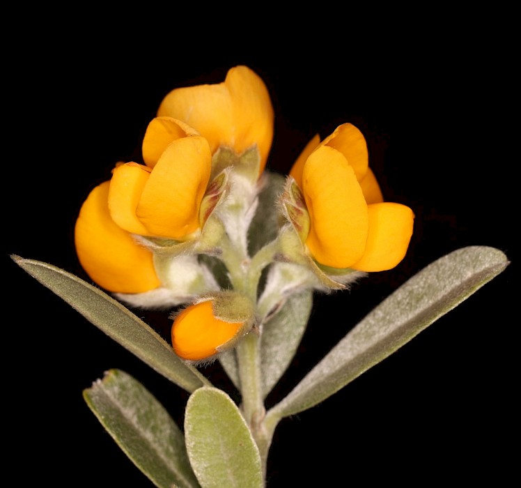 Tall, silvery, usually narrow evergreen shrub (<3-8 m tall) with densely silky, angular stems. Upright, ovalish leaves (35-55 mm long) are very silky both sides when young, and almost hairless on upper surfaces when older. Conspicuous orange-yellow spikes of pea-like flowers (10-15mm) appear in spring and are followed with a curved seedpod (13-17 mm) that is densely silky at first, becoming hairless, ribbed and hard as it matures, and containing 6-8 dull reddish-black seeds.