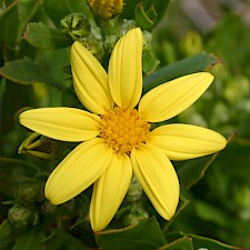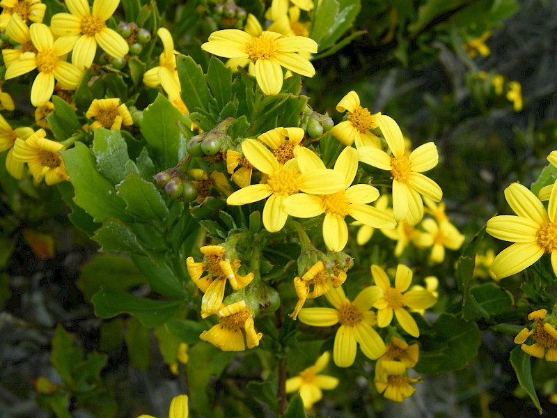 Bushy, semi-woody, much branched shrub or small tree (<2-3 m) with ribbed and woolly young stems that become smooth as they mature. Smooth, leathery, bright-green leaves (70 x 35 mm) have irregularly toothed edges and are arranged alternately on the stems. Bright yellow daisy-like flowers (25-30 mm diameter) are produced from September to February and are followed by hard oval green fruit (6-9 mm) which ripen to black and each contain a hard seed.