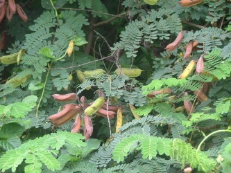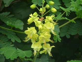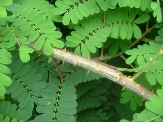 Spiny scrambling shrub (<15m tall). Young shoots finely ribbed and rounded, and stems are woody, with tapering, hooked spines where stems join with leaves, occasionally in pairs. Leaves are divided twice, first evenly into 5-10 leaflet pairs (8-20mm long) with no terminal leaflet, then into 6-12 pairs of tiny oval leaflets. Pale yellow, pea-like flowers (15 mm long) are grouped along the end of the stems (Jun-Nov), and are followed broad, oblong pods (7-10 x 2-3 cm) containing smooth, mottled brown seeds (8-10 mm long).
