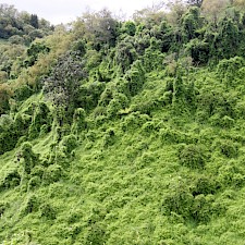 Smothers and kills all plants to the highest canopy, and prevents the establishment of native plant seedlings. Moves readily into established forest over canopy and by layering.