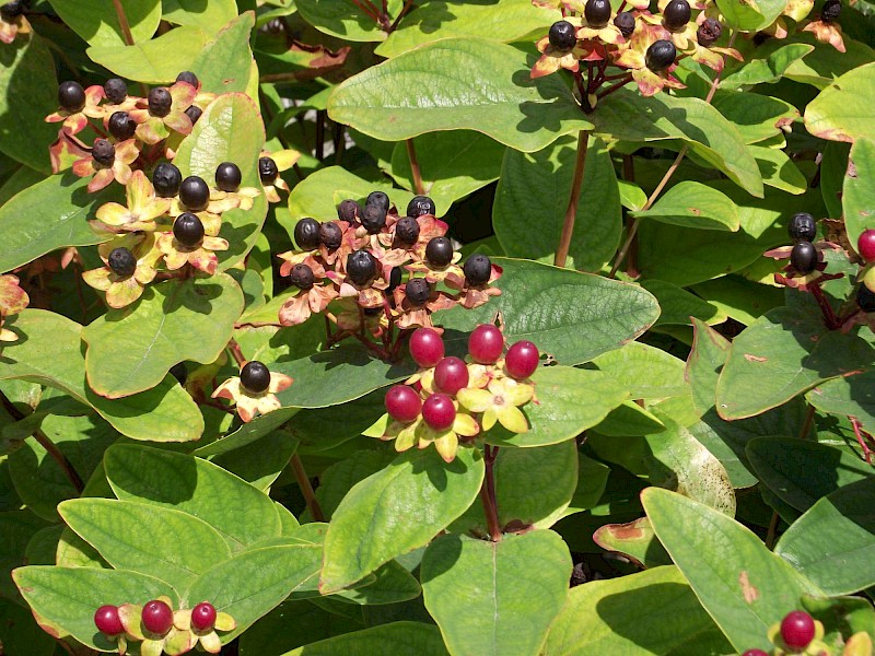 Rose of Sharon (Hypericum calycinum) has 7-9 cm diameter flowers, dry fruits, 4-angled stems and rhizomes. H x inodorum has fleshy fruit.